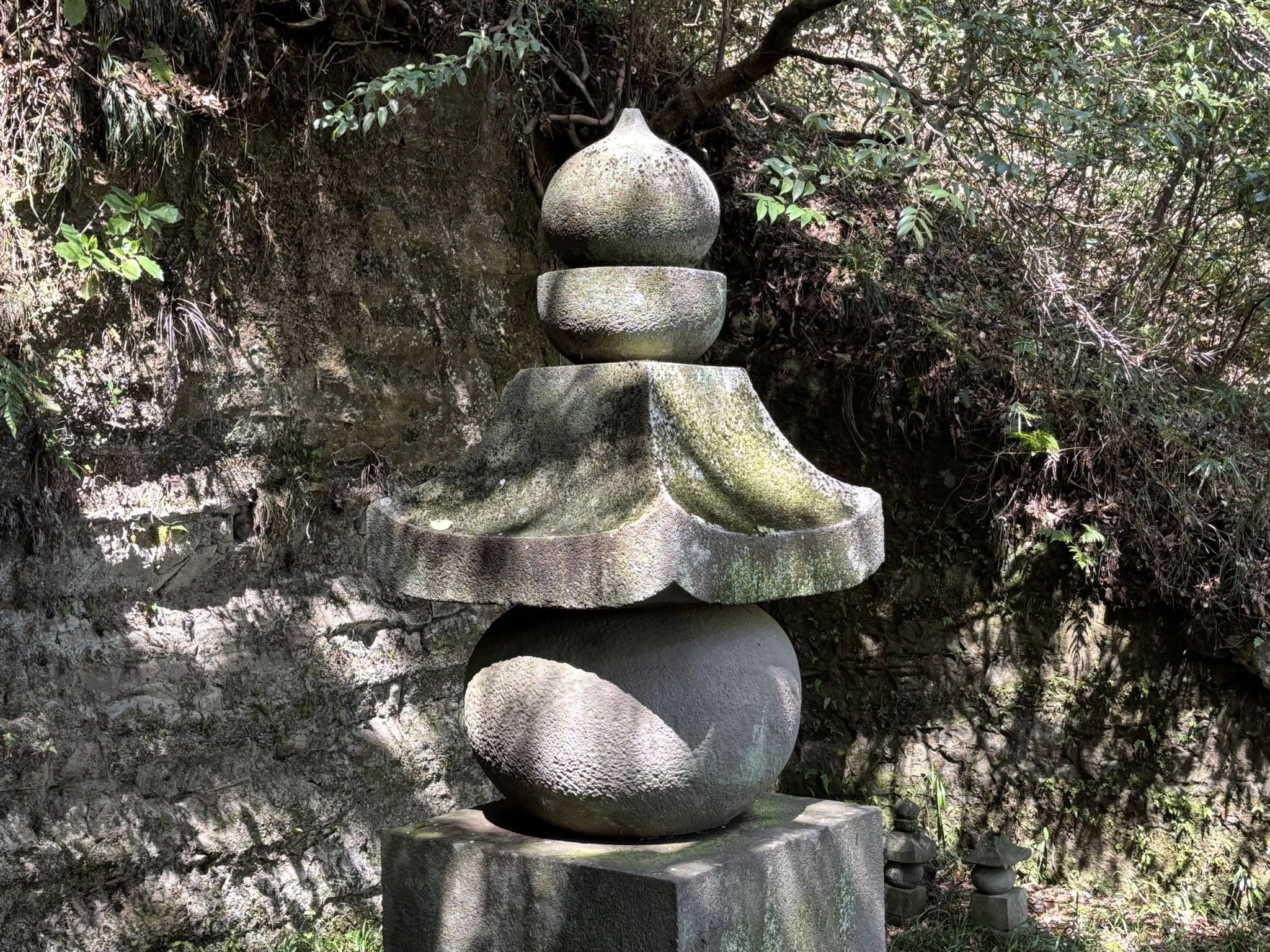 覚賢さんの五輪塔(高さ約3m)はしばらく前までは忍性さんの五輪塔だと思われていました。それが関東大震災で塔が崩れたことで、基盤底から火葬した骨粉が見つかり、骨蔵器に刻印された文字から覚賢さんの塔だと判明したのです。
